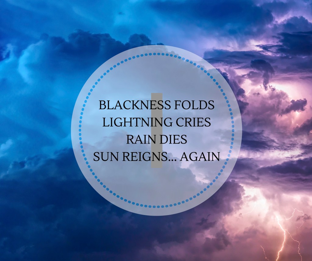 Posted on 22 October 201922 October 2019 by Fr. JohnBlackness Blackness foldsLightning criesRain diesSun reigns… again Share this: Click to share on X (Opens in new window) X Click to share on Facebook (Opens in new window) Facebook Click to email a link to a friend (Opens in new window) Email Like Loading... Related