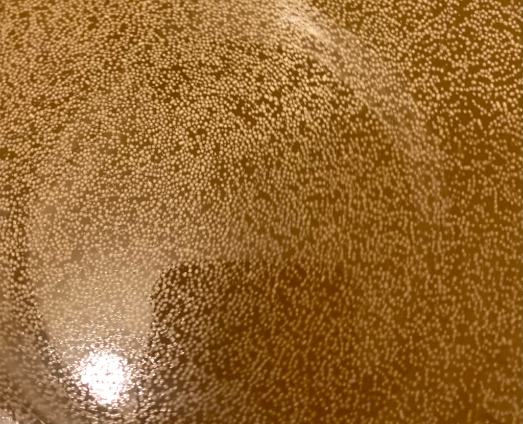 What is this, you ask. It appears to be nothing extraordinary. Merely dots on the surface of some sludge from the nether regions of Hades, but… Ah… to the Vintner (Amateur) Extraordinaire, it is a specific yeast fulfilling its life purpose in the fermenting of a most exquisite Pinot Grigio. If you were a wee yeast, you would be o-so-gratified in knowing that you have been chosen to consume the sugars of so fine an Italian grape and transform it into…. well, we shall just have to see. It still doesn’t have a name, but… were I writing this in the time of cholera, it would have notes of love and paddle-boat cruises along a lazy river… I digress. Here’s to winemaking… a joy and always a surprise when you have that first sip. In another three months we shall know if it is a gift from above or a vinaigrette deserving of the toilet!