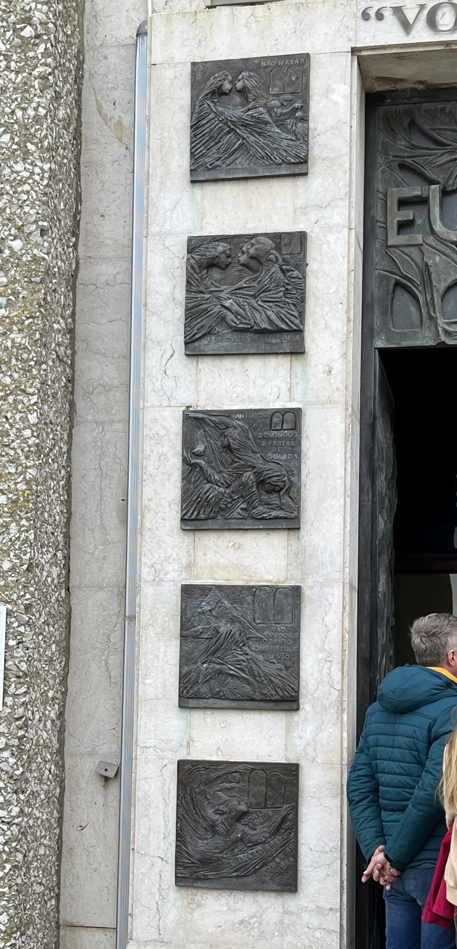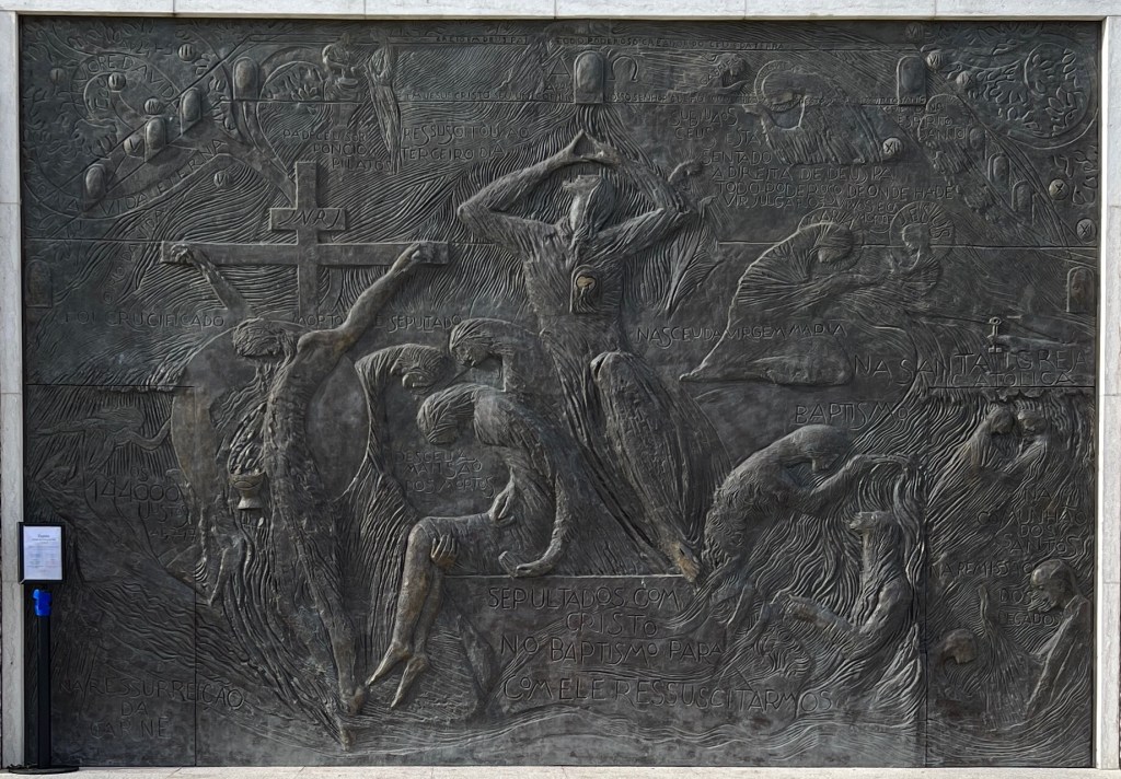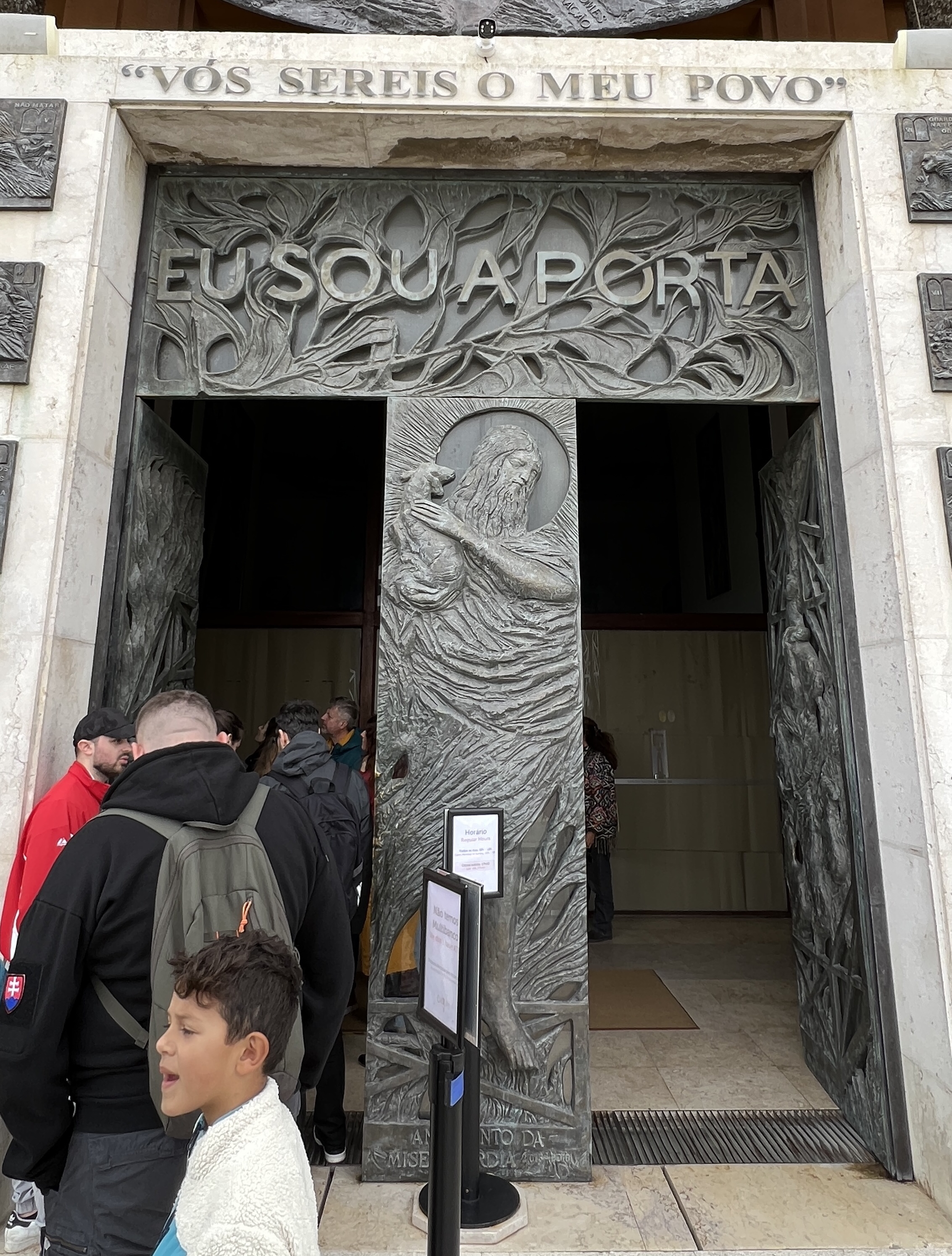 It took about an hour in line, but I enjoyed the bronze art (The Ten Commandments on either side of the door) and the main doors (St. John the Baptist holding the lamb, which I had to touch on my way in.) Eu sou a porta is printed above the doorโโI am the Door.โ Several other pieces of art adorned the walls on the inside, and one, in particular, caught my eye when I realized it was Pope John Paul II.