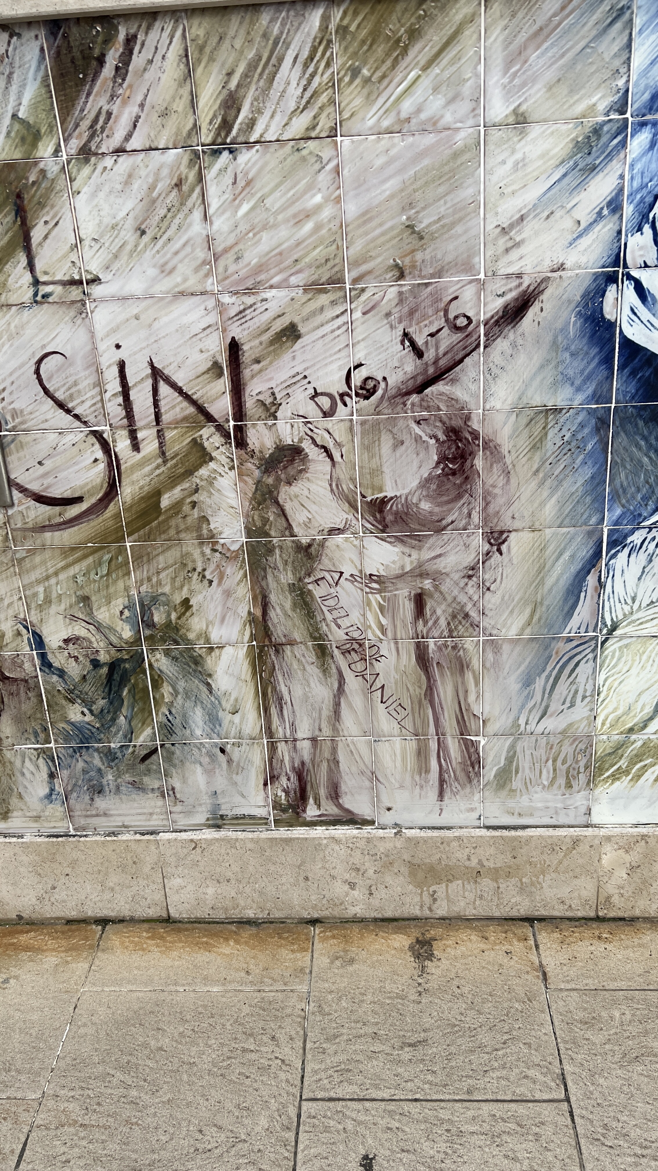 Images painted on the ceramic tiles at the base of the statueโฆ