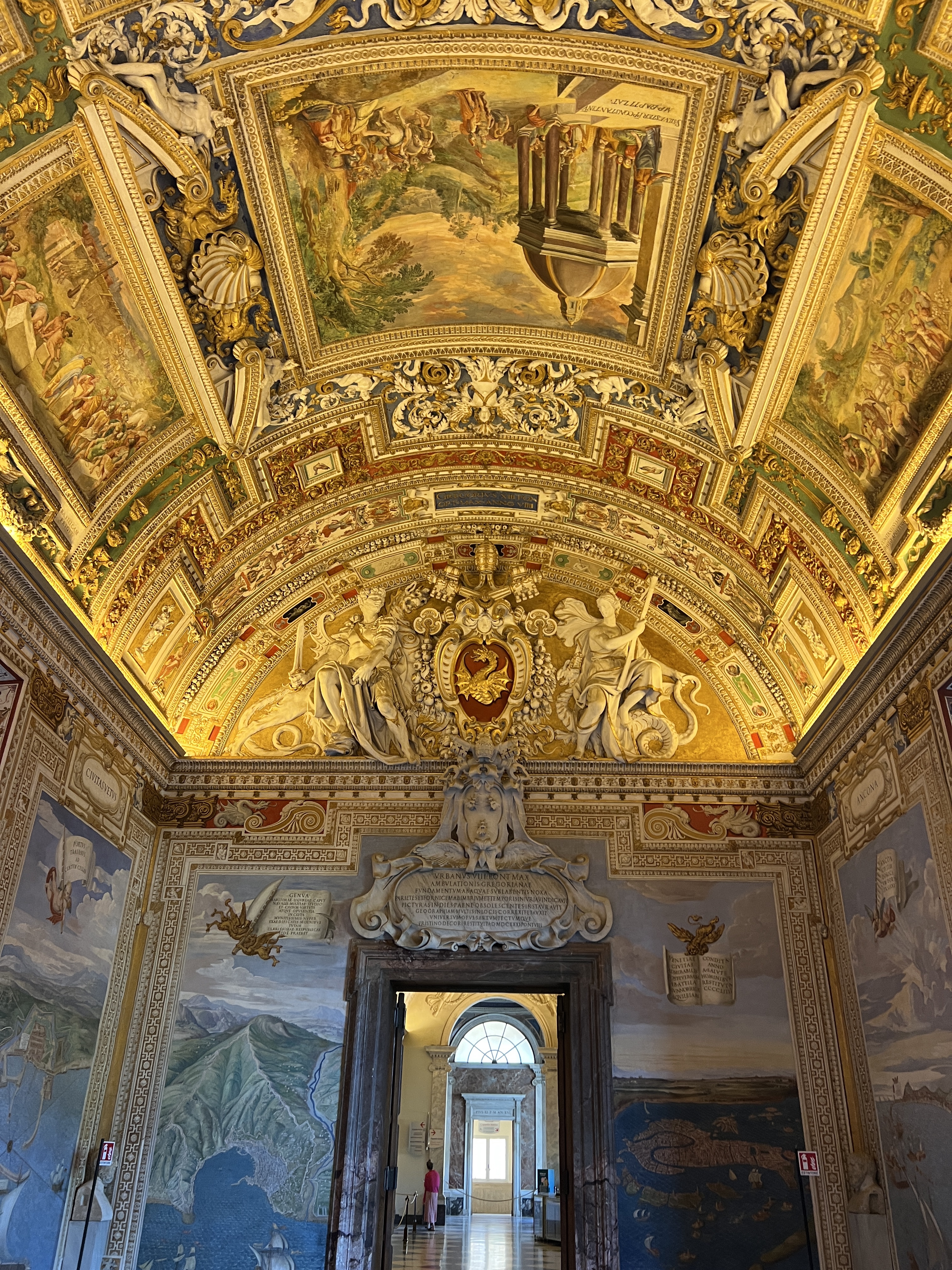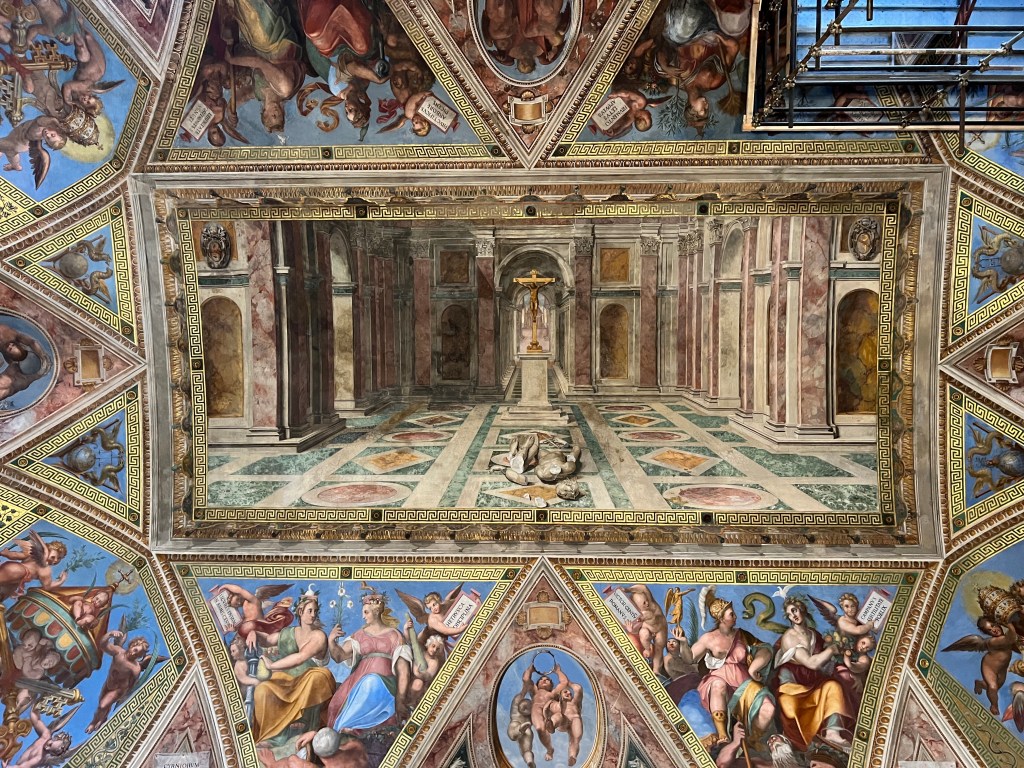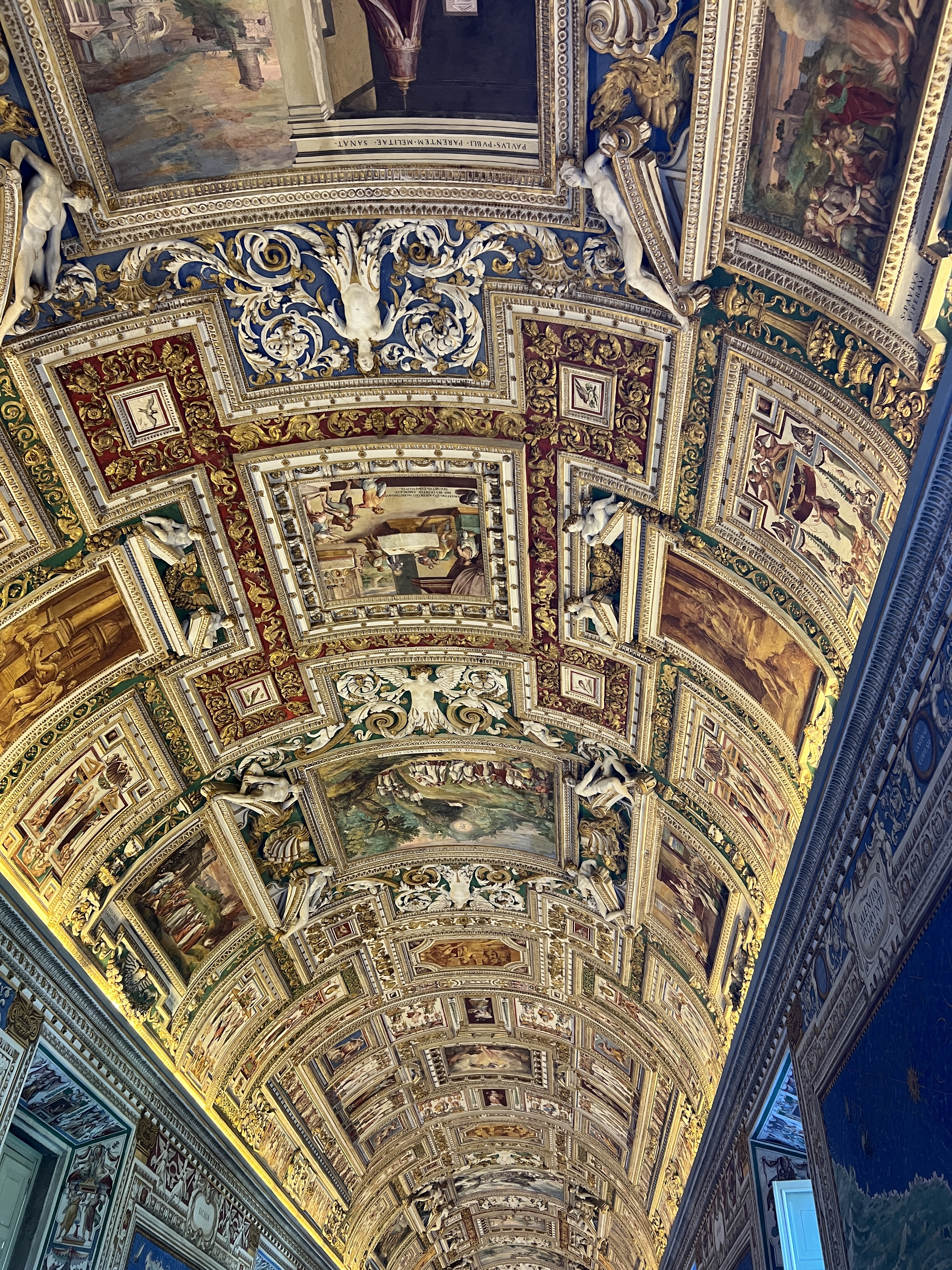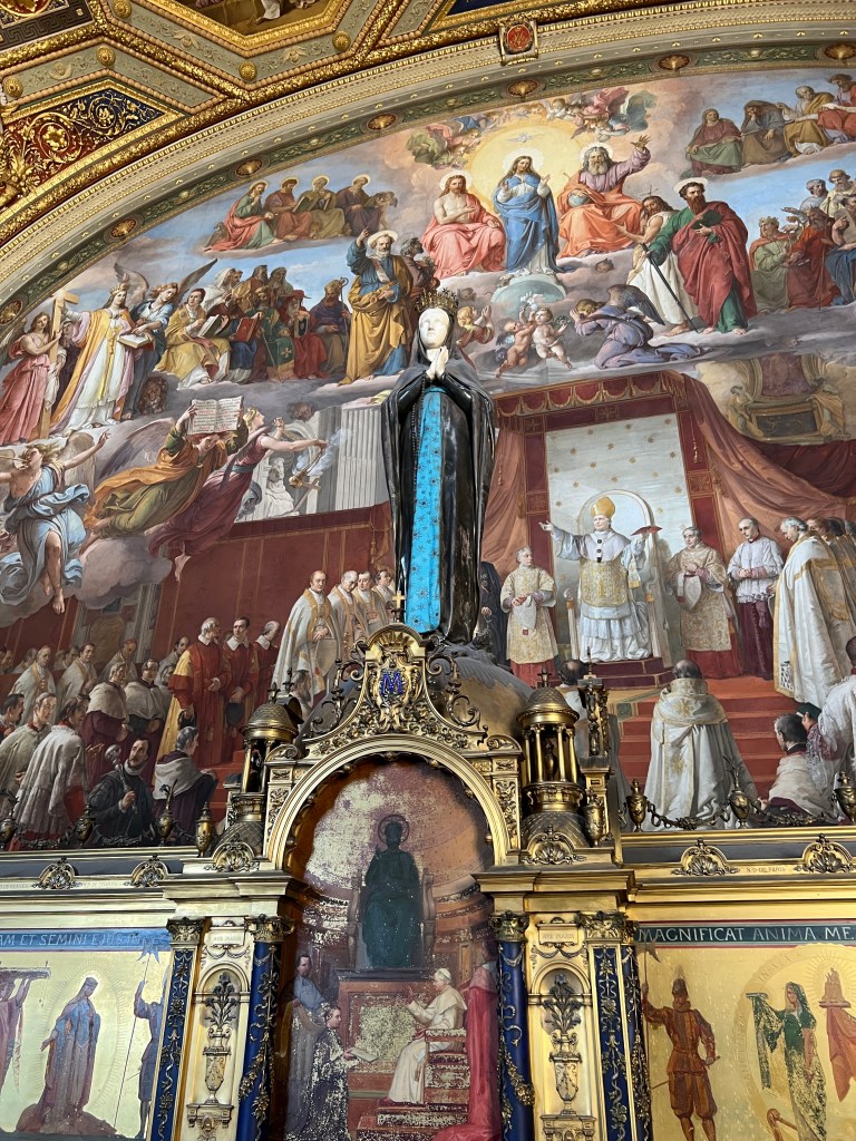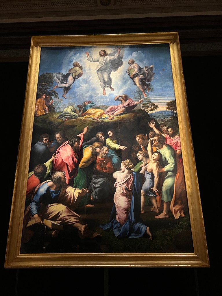 The room dedicated to the pronouncement of the Immaculate Conception of Mary along with the supporting documents in multiple languages.Look closely and you will see the conquest of Christianity over paganism.Ceiling of the hallway leading to the Papal apartments. I was very interested in seeing the apartment of Ricardo Borgia, but we passed through it very quickly. Not necessarily an era they are proud of but more than little colorful.The Transfiguration by Raphael. You see Jesus being transfigured in the upper half and the boy who was demon possessed in the lower right that Jesus would come and heal following the Transfiguration. The Disciples are on the bottom left and were unable to heal the boy.The Sistine Chapelโฆ โCan we talk?โ There is so much more going on here than I was aware of. Our tour guide was brilliant in helping me to understand parts of it, but it is definitely worth more time in study. Jesus, Moses, Heaven, hell, Saints, Prophetsโฆ I was not here long enough to pray my Rosary but I prayed as much of it as I could before we were ushered out. Yesโฆ I prayed a Rosary in the Sistine Chapel and I felt it. Amazing.
