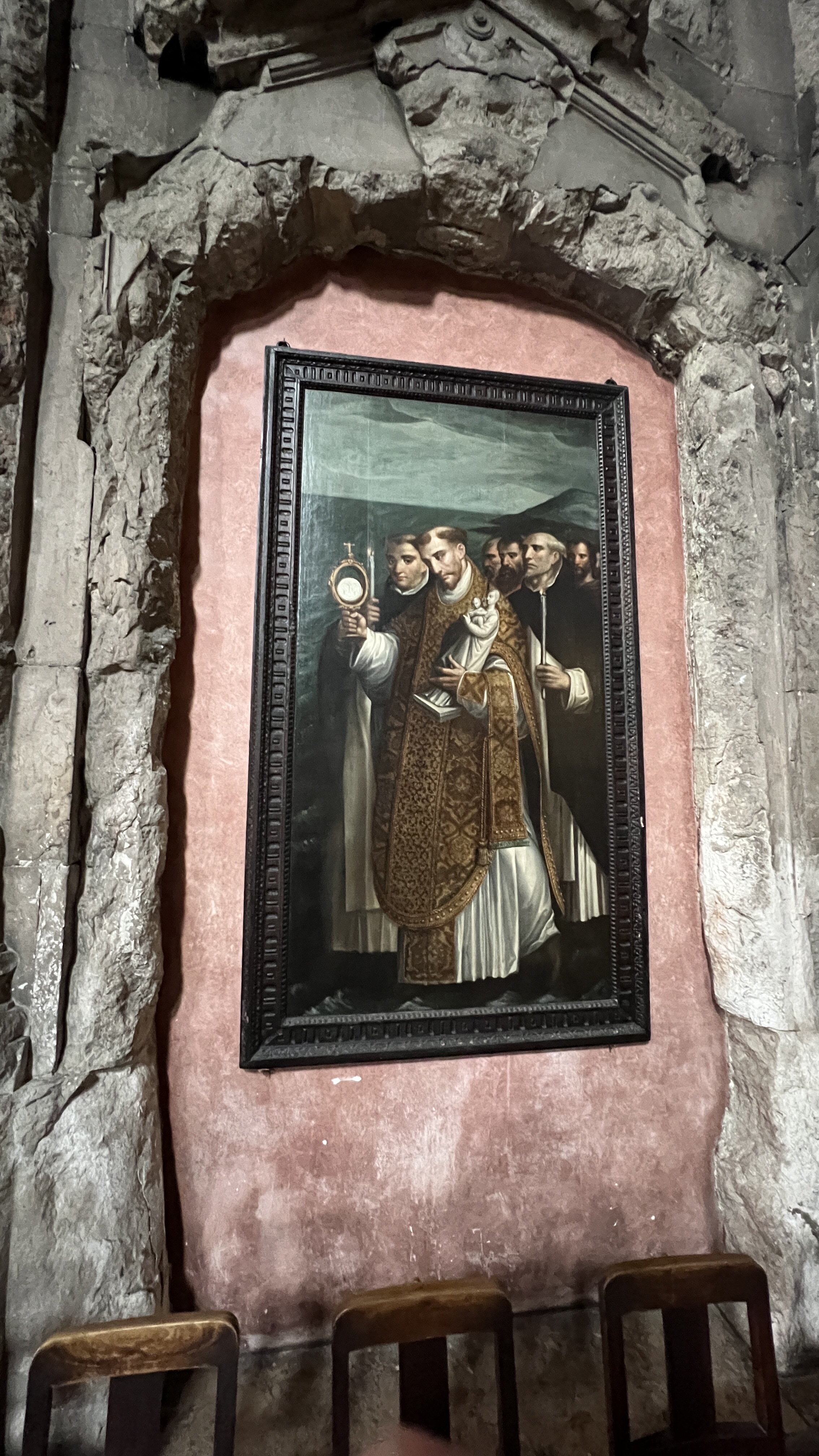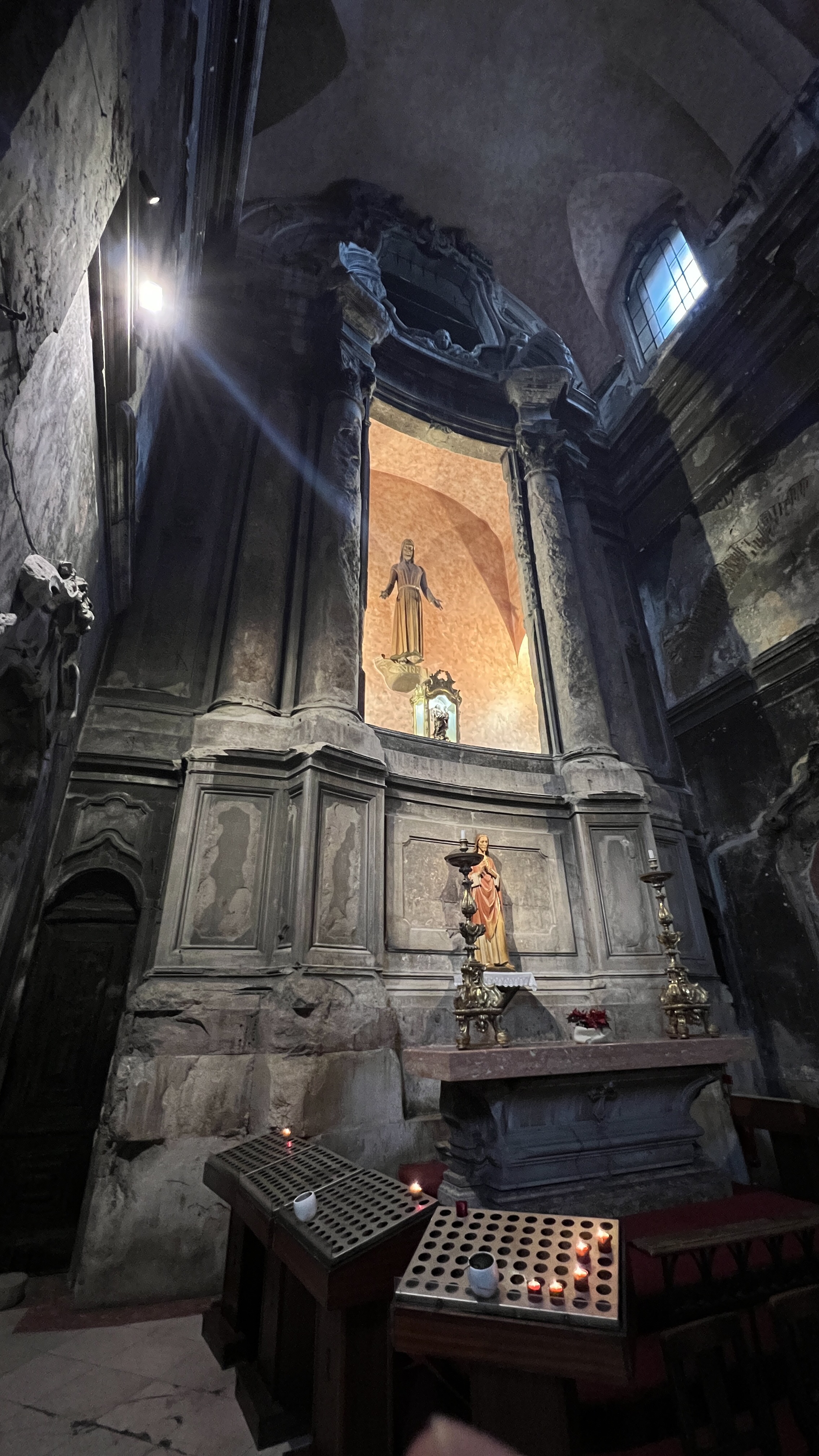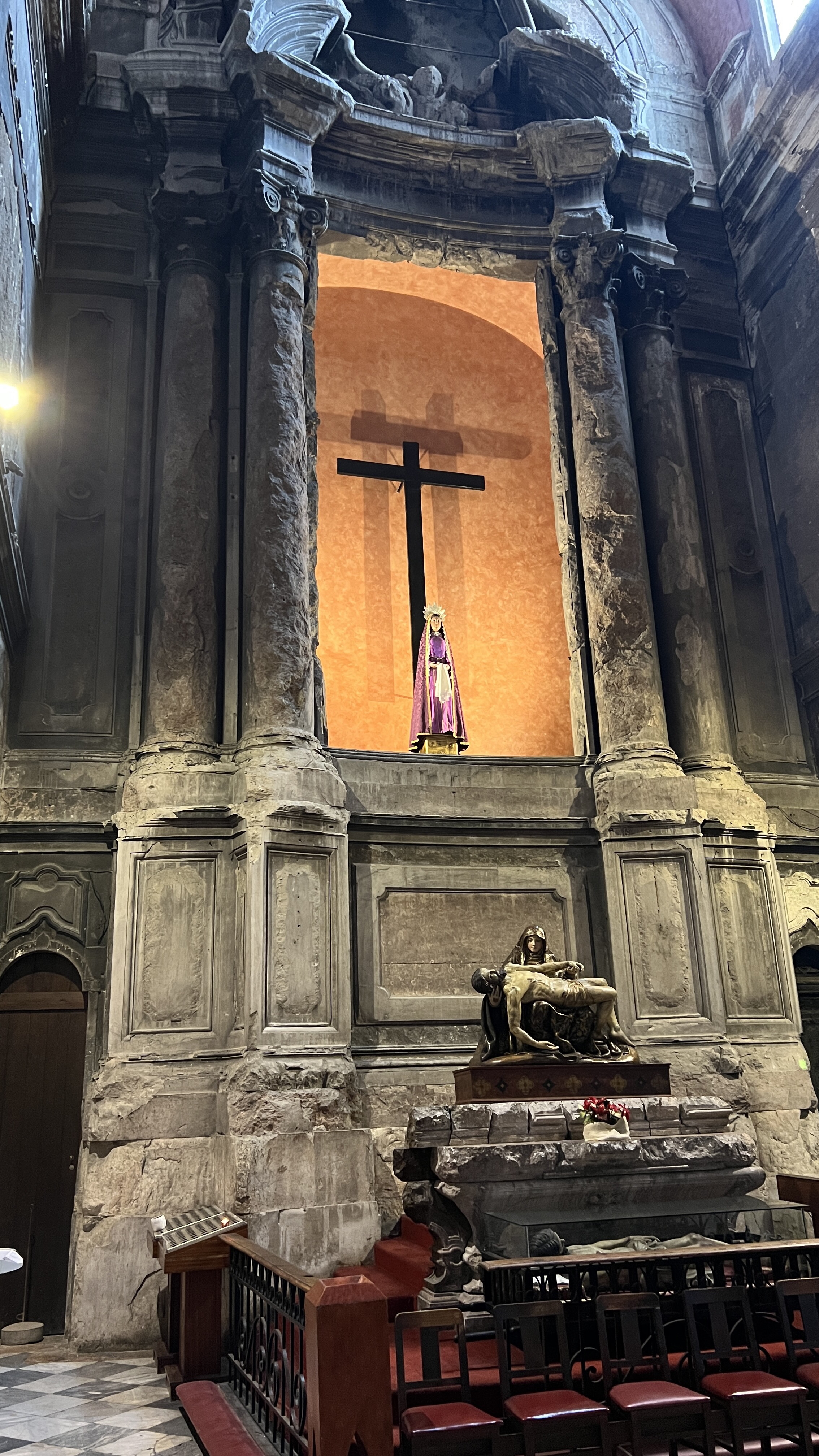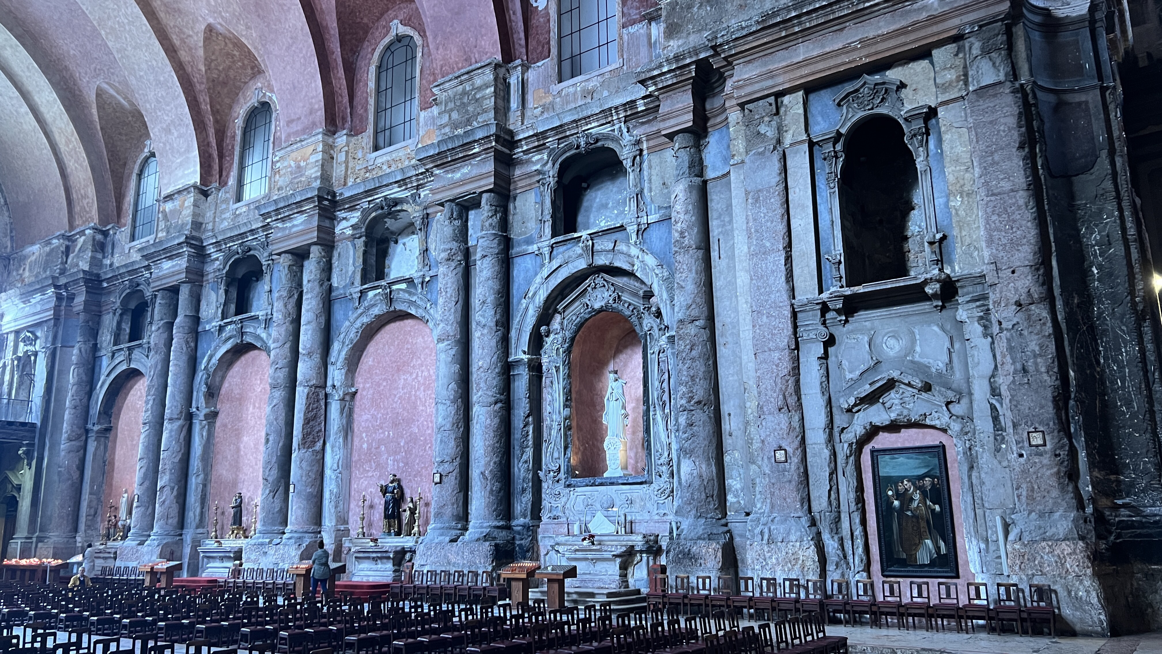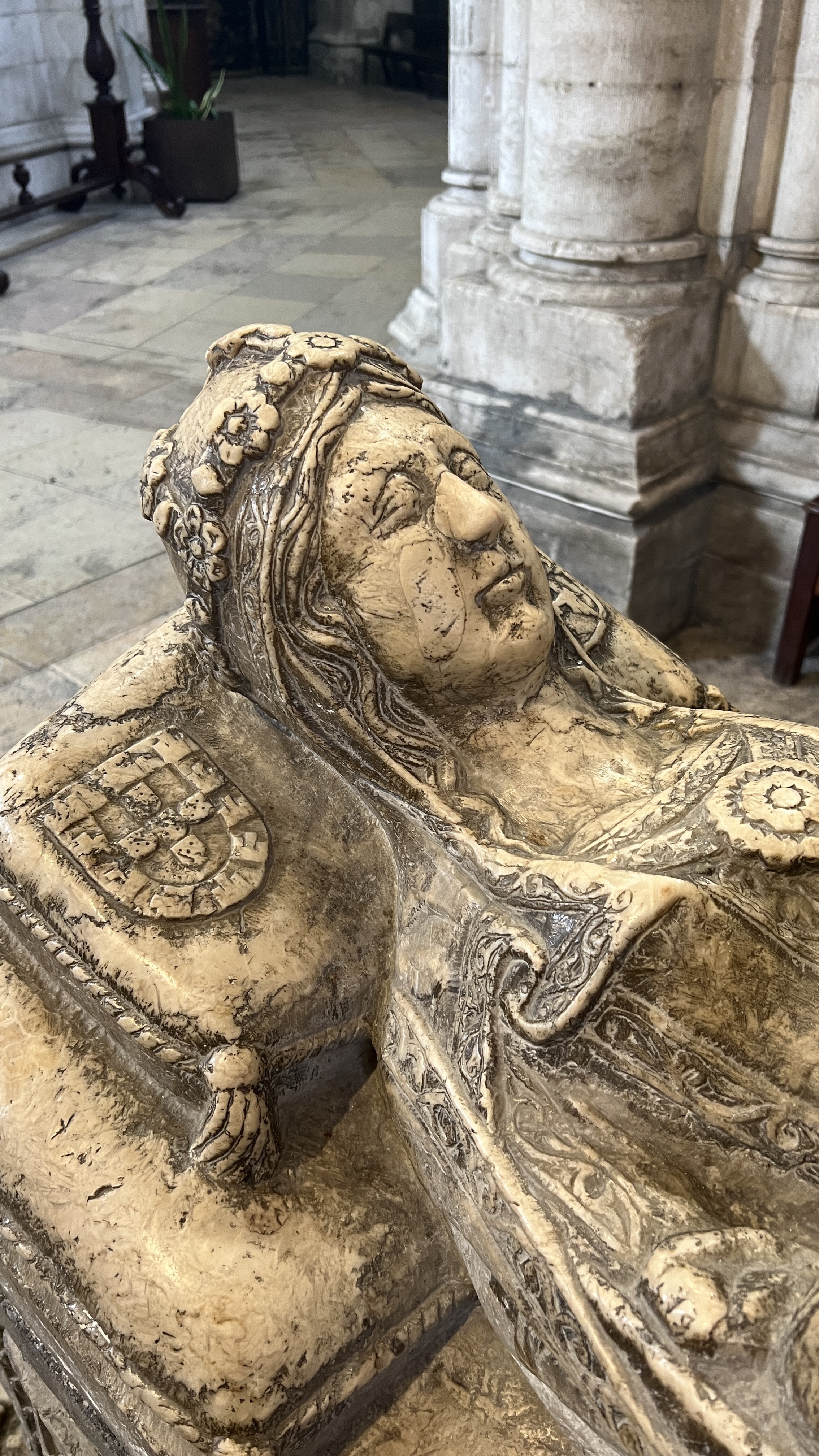 Over the yearsโit was built in the 12th century!!โit has suffered damage from several earthquakes, but each time, the people of Lisbon work to restore its beauty. So far, the churches in Lisbon are far more austere than those of Florence and Rome. In their architecture and appointments, they indicate strength. They are definitely places the crusaders would have felt at home. Inside is quite the same, with many side chapels adorned and beautiful statues. I plan to attend church here on Sunday.