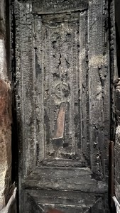 I was a few โHail Marysโ away from finishing my Rosary when I had a coughing spell and had to leave. It is distant, but you can still smell the smoke from the fire, and there is still evidence of those flames. Touch the door, and your hand will come away black.