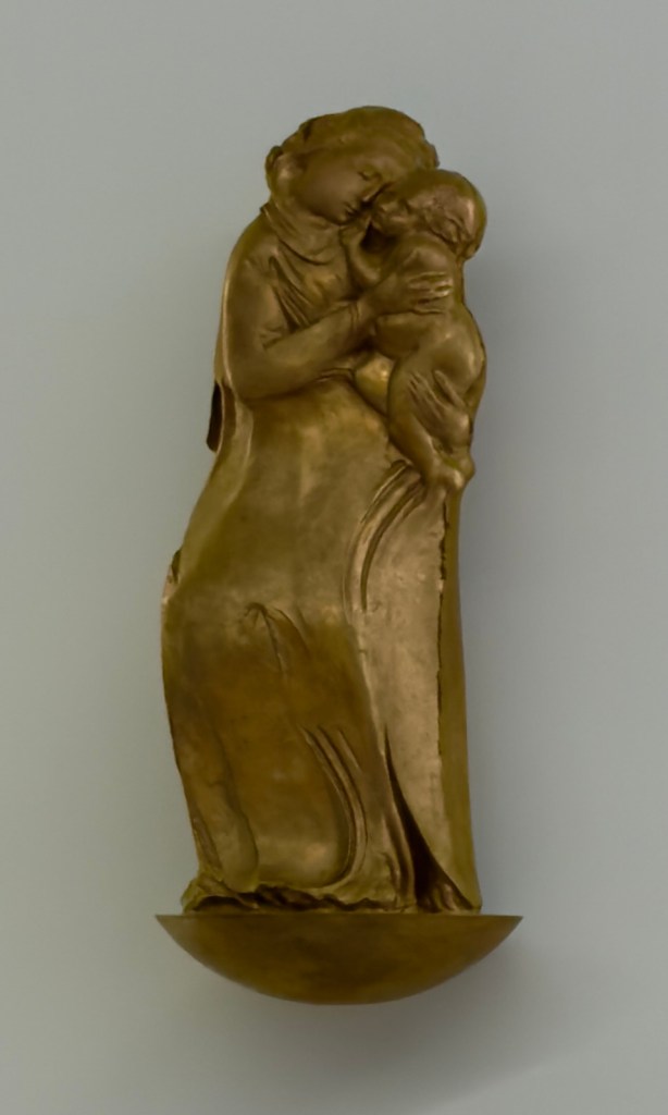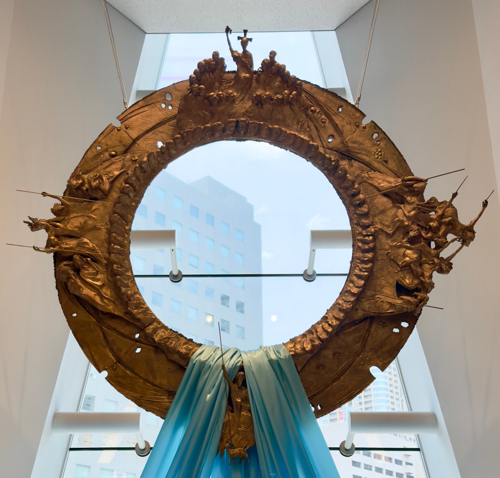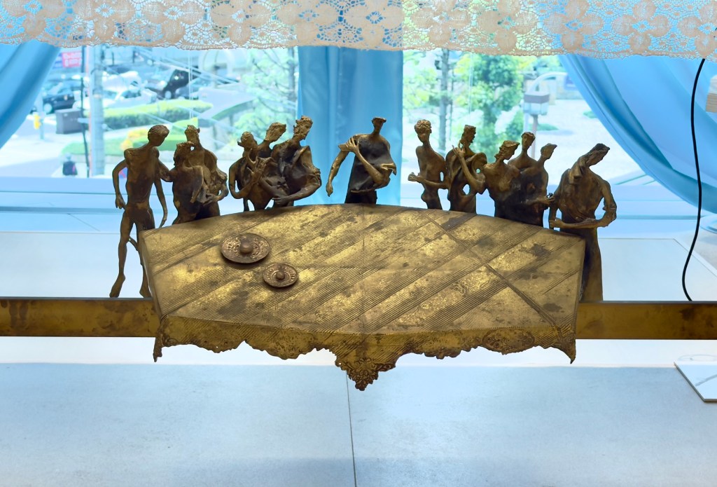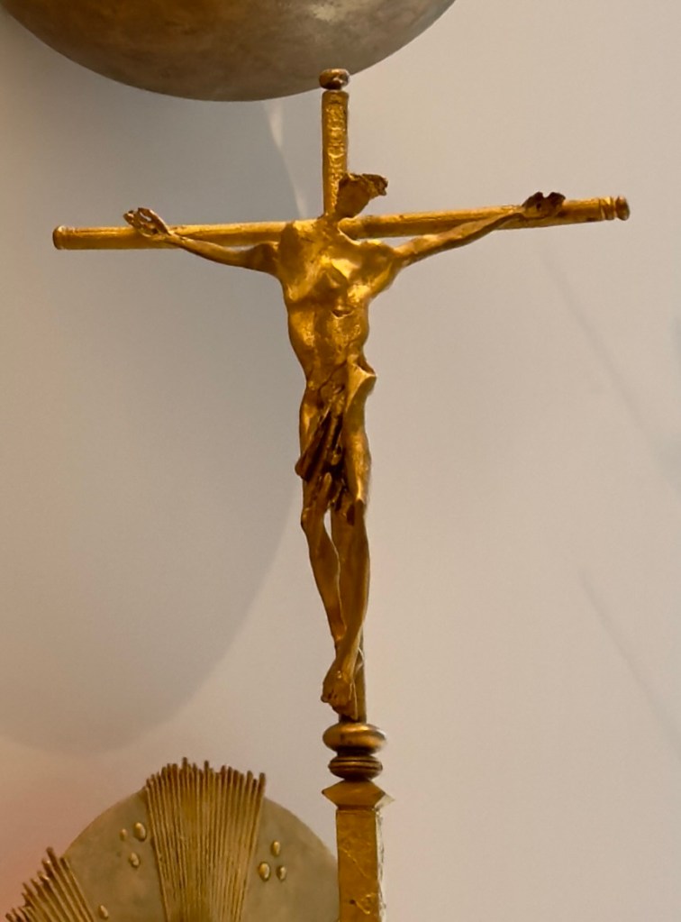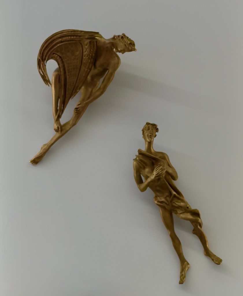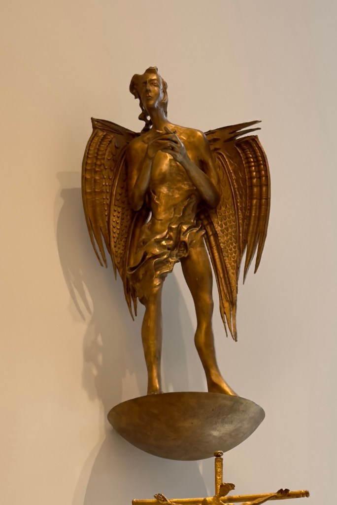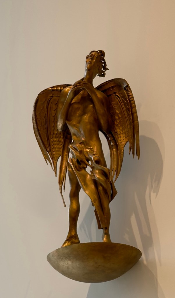 Utilizing the natural light, the pure white church marvelously brings out the grace and lightness of the bronze sculpture by Bonanotte.
