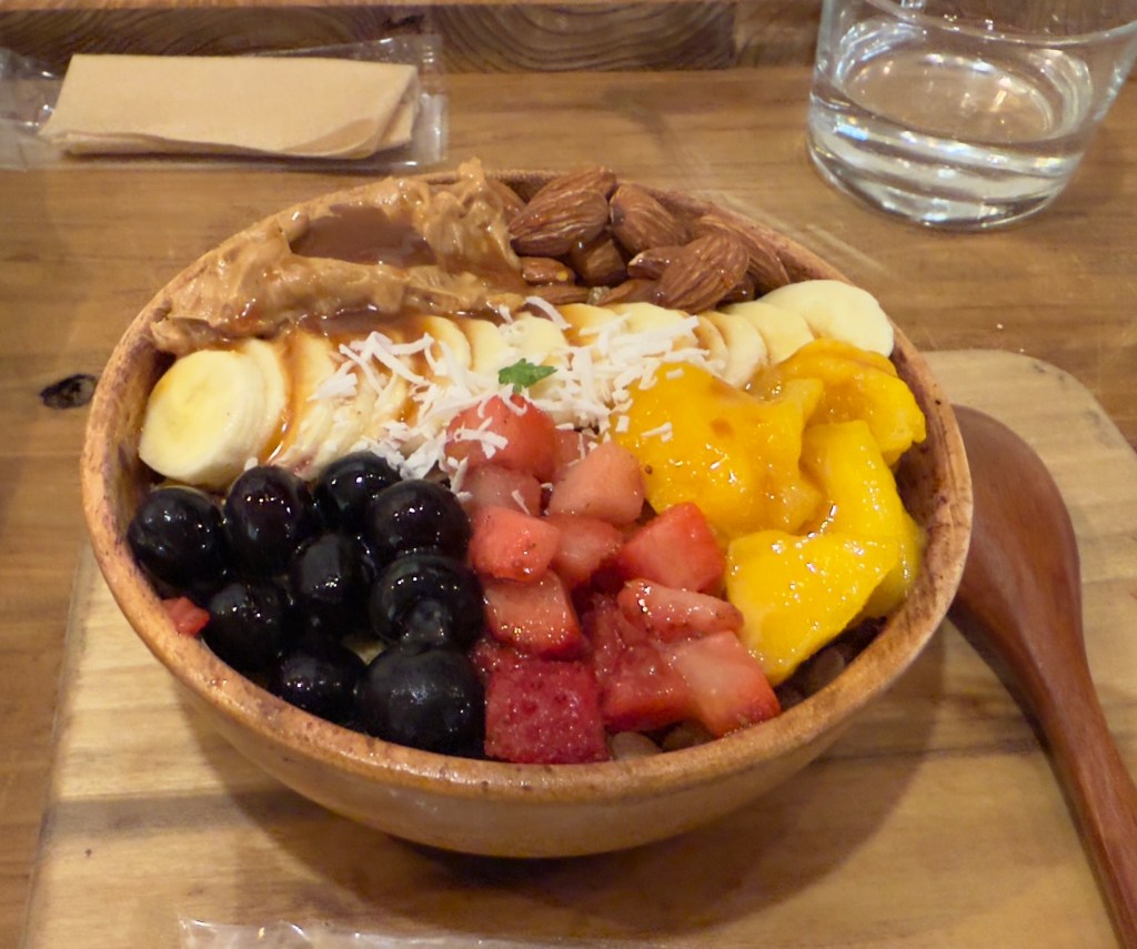 Peanut butter with honey, almonds, blue berries, strawberries, banana, peach, coconut, granola, aรงai. Yum!