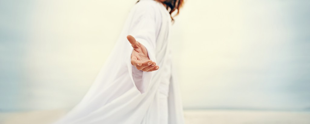 Shot of Jesus standing with his hand outstretched on a bare landscape