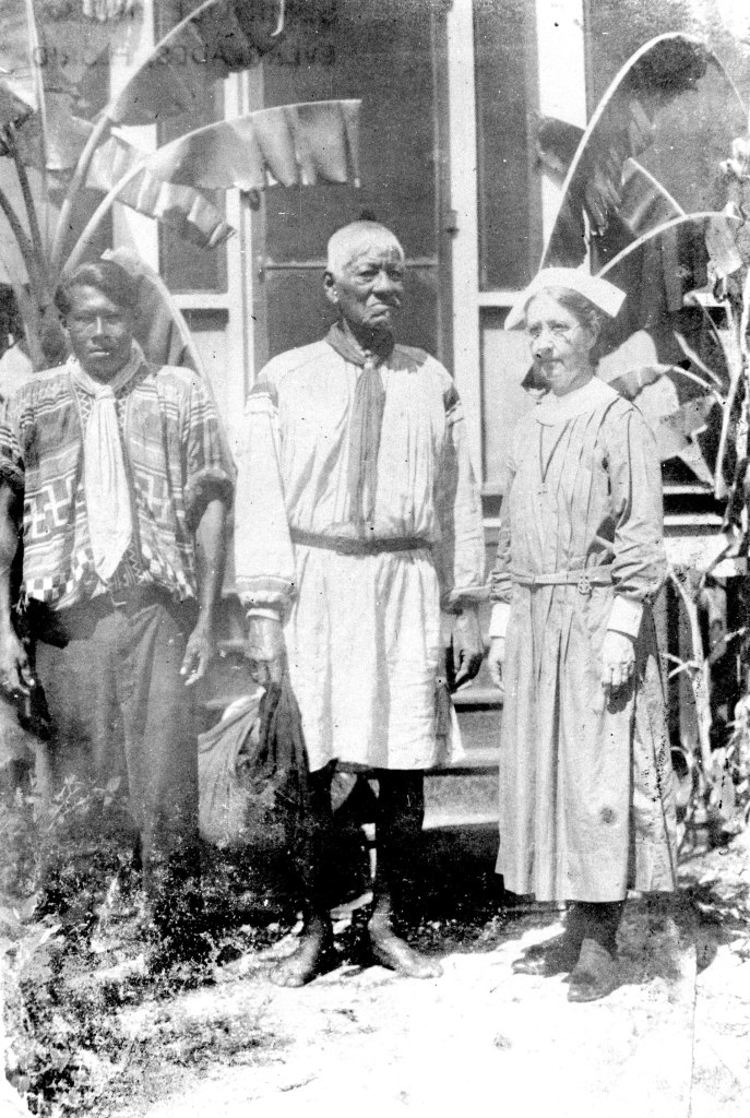 Deaconess Bedell with a medicine man and Bobby Jim Tiger outside the Seminole mission