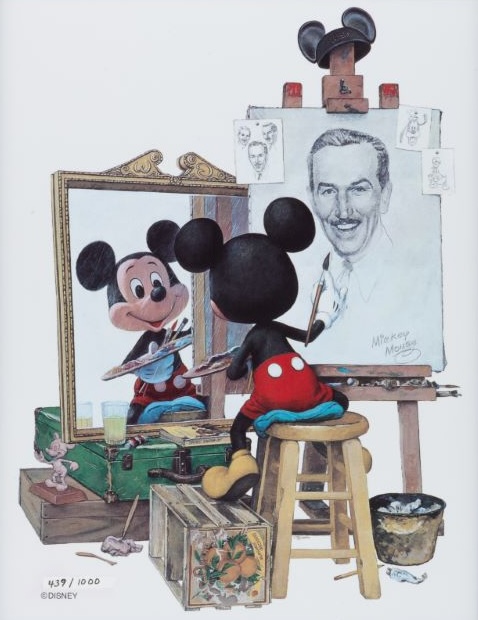 One more artist, perhaps you’ve not heard of—Charles Boyer. Boyer began working for Walt Disney and Disneyland in 1960. In one of his paintings, he has Mickey Mouse painting a self-portrait. Mickey is leaning over, looking in a mirror, and busily painting his portrait. However, the image on the canvas is not that of Mickey Mouse. It is Walt Disney. Mickey Mouse is painting the image of his creator that is within him.
