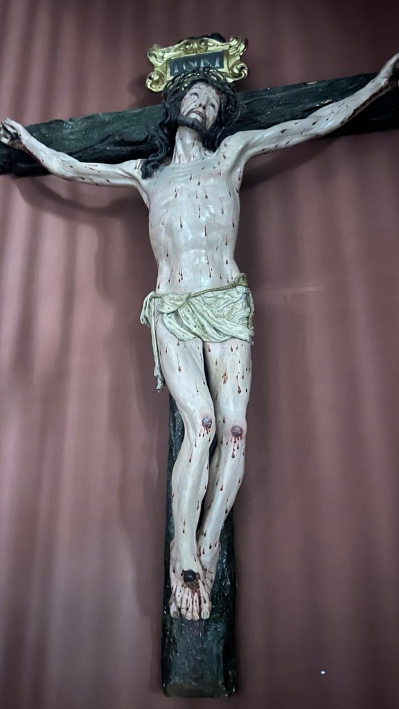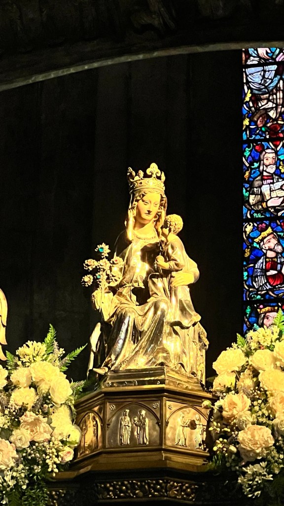 From the website: “The high altar of the temple is watched over by the Imagen de Santa María of Roncesvalles (Image of St. Mary of Roncesvalles), dating from the 14th century, a superb Gothic sculpture in silver-covered wood and decorated in gold.” St. James is there with her as is her crucified Son.