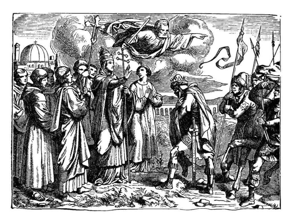 As Leo said these things Attila stood looking upon his venerable garb and aspect, silent, as if thinking deeply. And lo, suddenly there were seen the apostles Peter and Paul, clad like bishops, standing by Leo, the one on the right hand, the other on the left. They held swords stretched out over his head, and threatened Attila with death if he did not obey the pope’s command. Wherefore Attila was appeased he who had raged as one mad. He by Leo’s intercession, straightway promised a lasting peace and withdrew beyond the Danube.”