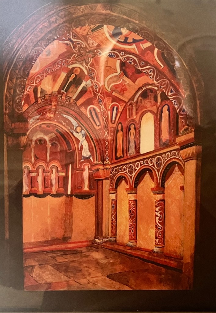 Cormac’s Chapel dates to the 11th century. Pictured below is the restored chapel. In the process of the restoration, beautiful frescos were discovered beneath the centuries of dirt and whitewash. Although no longer fully intact, the second image is what it is believed to have originally looked like.