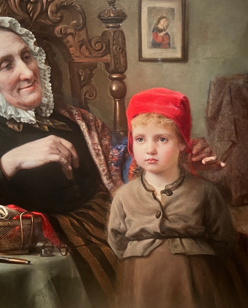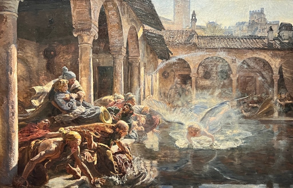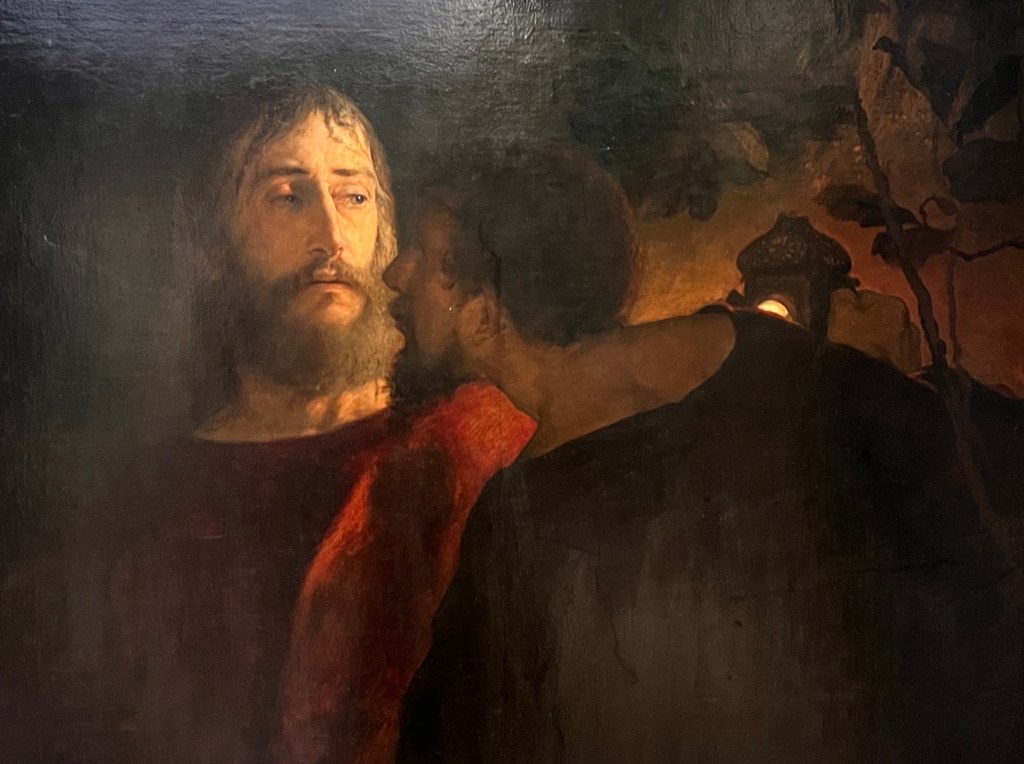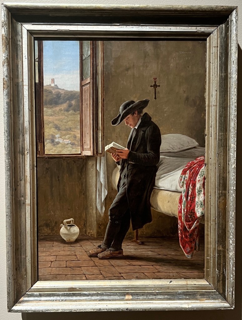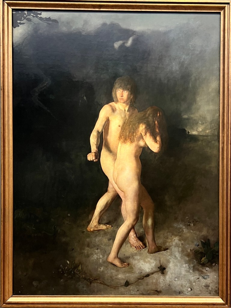 This is “The Vicar and Moses.” Apparently, Moses was not impressed with the Vicar’s preaching as he fell asleep. Lavik by Moonlight / Johan Christian Dahl. Landscapes bathed in moonlight are full of atmosphere and mystery. Such scenes are popular in 19 century painting and are one of Dahl’s specialities. The painting depicts the harbour town of Larvik on the Oslofjord, with an emphasis on shipping trade and the lumber industry. People appear small in relation to nature.I forgot to take a picture of the plaque of this one, but I liked it so you get to see it. Abbot Reading by Martinus RørbyeJudas Iscariot by Ellif Peterssen. I was very pleased with the way this photo came out. In the museum, Judas was so dark that you could barely see him. I guess the camera setting brightened  him up a bit.The Expulsion from Paradise by Hans Heyerdahl. I’m not even going to tell you the name of this one. You already know. It is by Harriet BackerThe Angel Touching the Water in the Pool of Bethesda by Joakim Skovgaard. This and the one of the expulsion from the garden interested me because it’s not something you normally see in a painting. At least I haven’t.