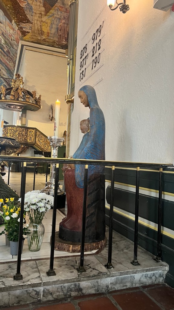 Today, I attended Mass at the Oslo Domkirke (Cathedral), built between 1694-97, restored in 2010. As you approach from the front, you encounter the massive bronze doors depicting the Beatitudes. Across the top reads “Salice er,” “Blessed are….” Just to the right of the doors is “The Devil of Oslo,” a sculpture showing a man being consumed by evil, represented by a lion and a dragon. It was created in the 12th century and found in the ruins of St. Hallvard’s Cathedra.