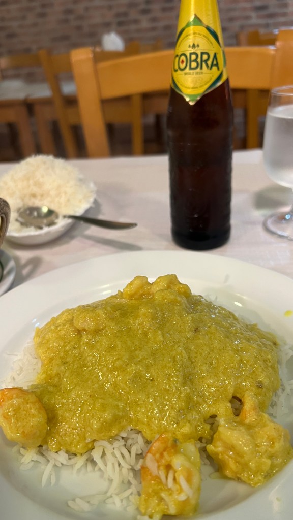 I enjoyed a bright yellowed Garnele Korma. I looked that up before I went because I know that sometimes Indian food can get more than a little spicy. The korma is a mild dish; despite the look of the picture, it was lightly curried, and the shrimp were perfectly cooked. It was served over a very long grain white rice. The Cobra beer was also a first. I can recommend it and Iโm not a big beer person.
