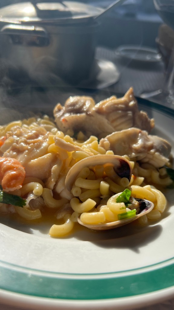 I enjoyed the Prawn Cocktail, Seafood Pasta (lobsterโI donโt think there was much, clams, shrimp, and pasta in a thin broth. Very good! This was served with 1/2 bottle of Maria Joaquina red wine and some sparkling water. I finished up with a very yummy cafรฉ and Creme Catalรฃoโthink creme brulรฉ on crack. It was a delicious meal.