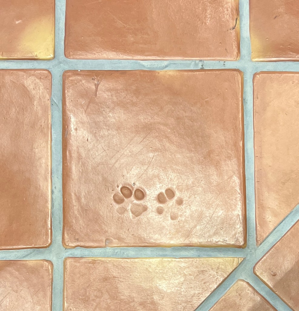 The floor tiles were made in Guatemala and dried outside. Throughout the building, you can see the tracks of the animals that passed by before the tiles were set.