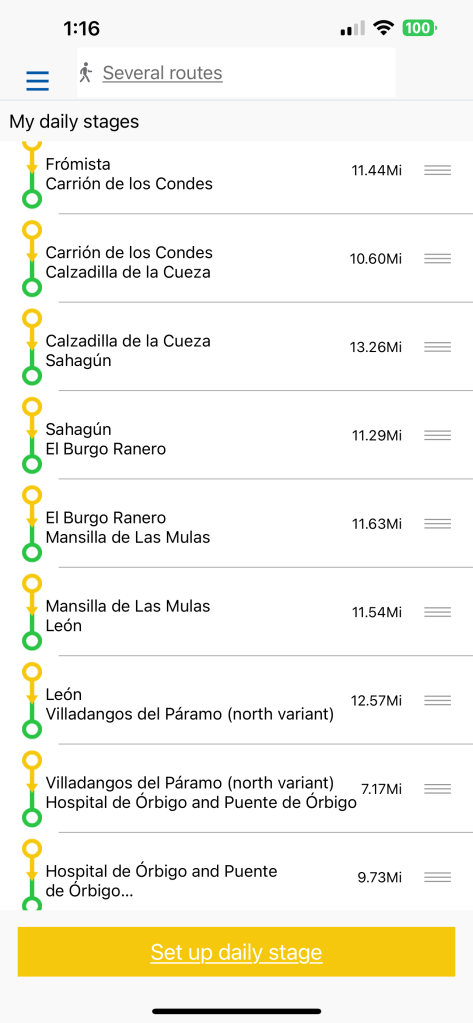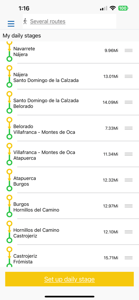 I’ve scheduled sixty days on the Camino with 46 walking days and 14 days off. This is what those stages look like, but could change once I’m there.