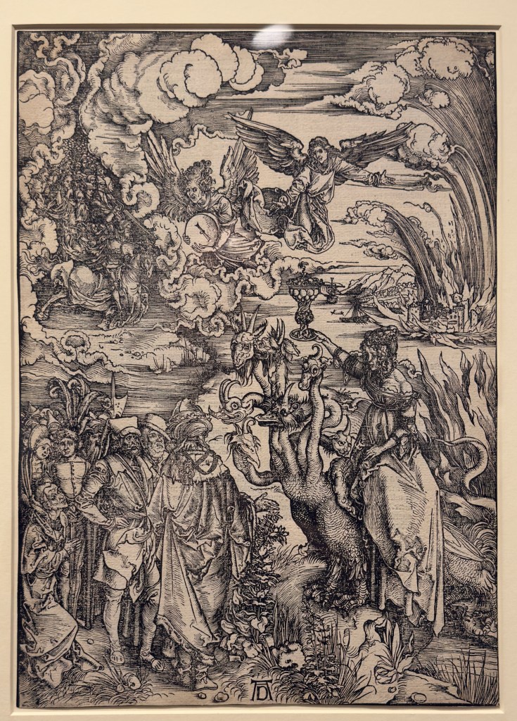 Finally, there was a fine etching by the German artist Albrecht Dรผrer titled The Babylonian Whore, a depiction of a scene from the Book of Revelation.